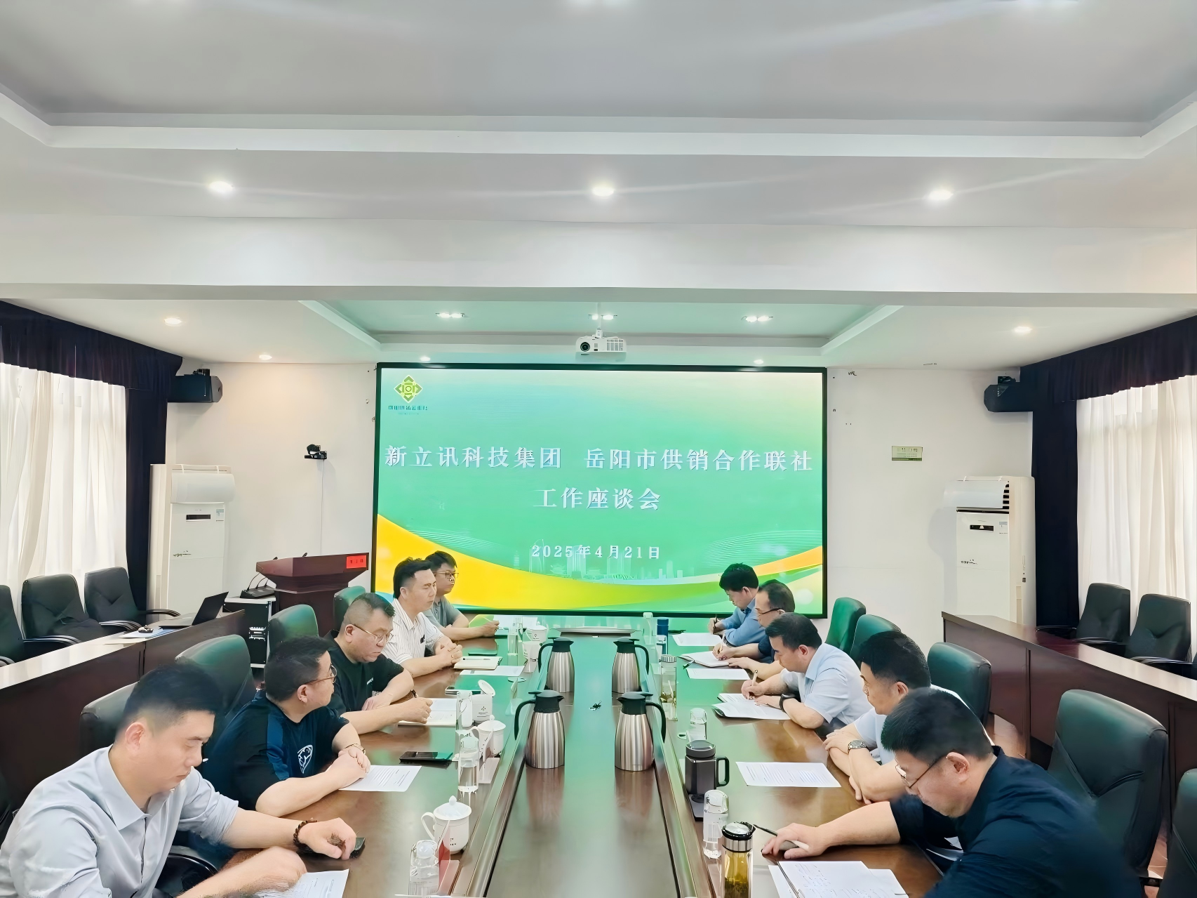 2025年4月21日,岳陽市供銷合作聯社&新立訊科技集團“華中農產品交易中心工作座談會”在岳陽市供銷合作聯社召開。岳陽市社黨委書記、理事會主任向風行,市社黨委副書記、監事會主任羅海,市社黨委委員、副主任周傳龍、鄒變龍、周傲文,岳陽農發集團總工程師李政,新立訊科技集團董事長(兼青海、華東、川藏交易中心董事長)毛霖等與會嘉賓出席并參與座談。