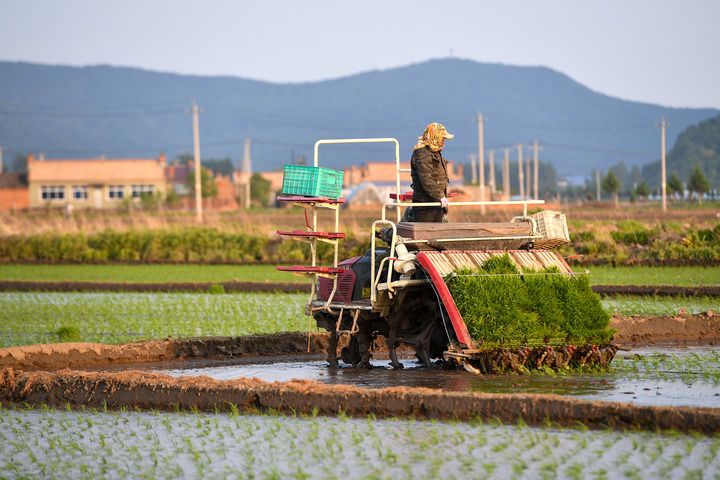在吉林省吉林市永吉縣鑫豐種植農(nóng)民專業(yè)合作社,農(nóng)民駕駛農(nóng)機進(jìn)行水稻插秧(2025年5月26日攝)。新華社記者 張楠 攝