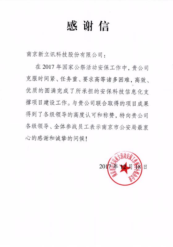 2017年12月13日,是第四個南京大屠殺死難者國家公祭日,也是南京大屠殺死難者遇難80周年,黨和國家領導人出席在侵華日軍南京大屠殺遇難同胞紀念館并參加國家公祭儀式。為此,新立訊成功建設侵華日軍南京大屠殺遇難同胞紀念館的安??萍夹畔⒒到y,并順利配合相關機構完成國家公祭日期間的政保任務,保證國家公祭日活動順利開展。2018年2月7日,新立訊收到南京市公安局重大活動安保工作領導小組辦公室針對此安??萍夹畔⒒到y建設的感謝信,對新立訊高效、優質的項目建設工作予以高度評價并致以衷心感謝。