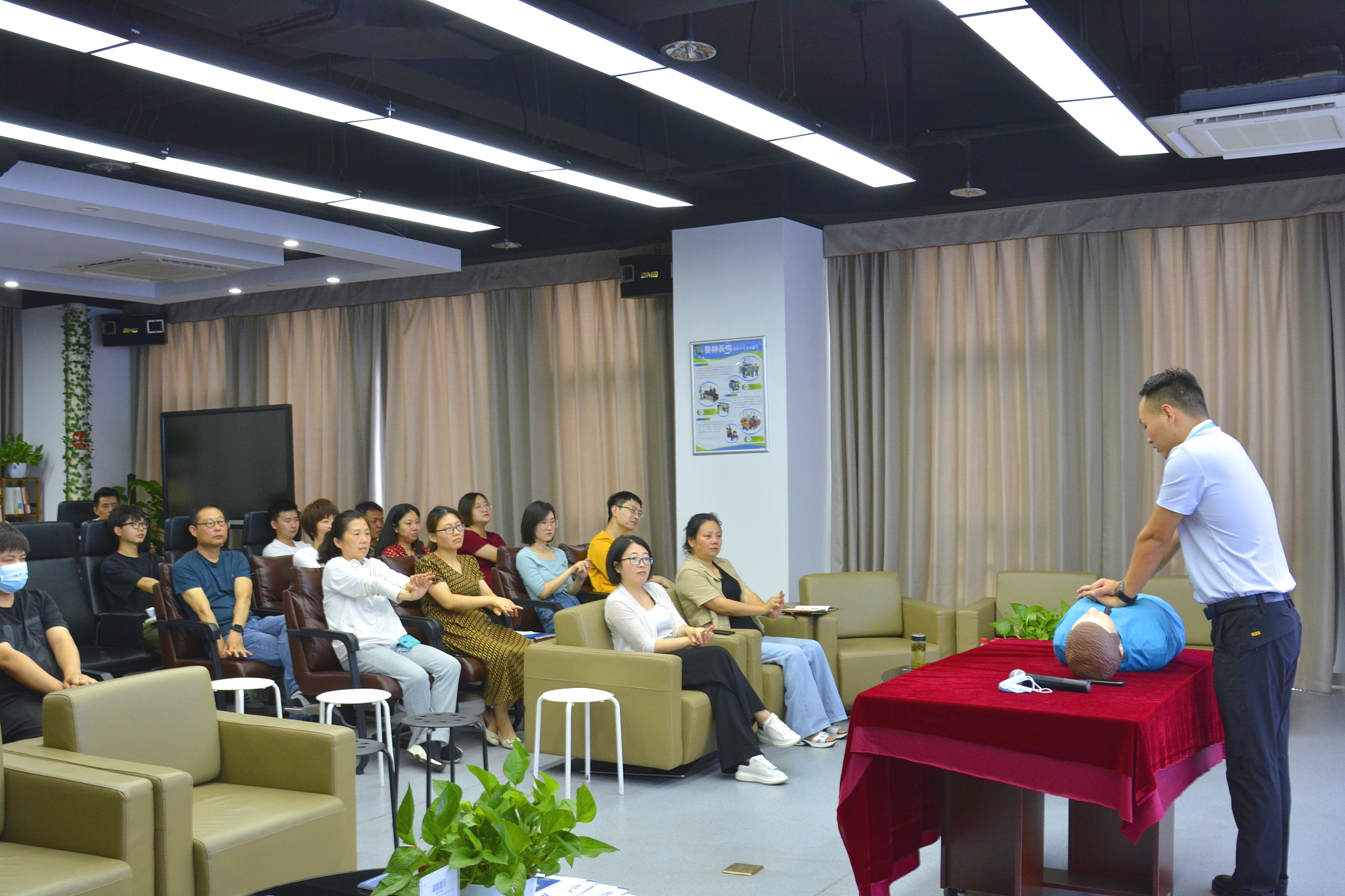 活動(dòng)中,任樂(lè)義老師生動(dòng)幽默地為大家講解了突發(fā)意外傷害的急救處理方法,并現(xiàn)場(chǎng)演示了心肺復(fù)蘇術(shù)、人工呼吸、海姆立克急救法等相關(guān)救護(hù)操作,同時(shí)給大家普及了重大疾病案例分析及預(yù)防措施、亞健康、慢性疾病的預(yù)防,包括肺癌、肝癌、胃癌、宮頸癌、慢性病等早期信號(hào)及預(yù)防方法。同事們認(rèn)真聆聽(tīng),細(xì)心觀看,還現(xiàn)場(chǎng)進(jìn)行了操作演練。
