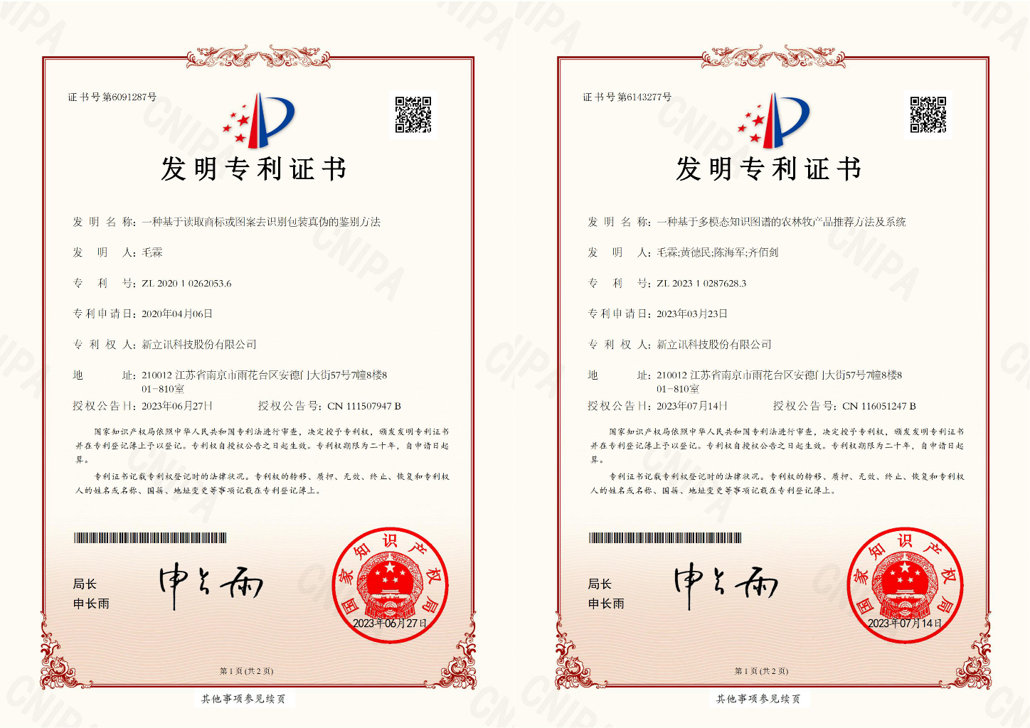 7月,新立訊知識產權領域再獲兩項發明專利,分別是“一種基于讀取商標或圖案去識別包裝真偽的鑒別方法”(專利號:ZL202010262053.6),“一種基于多模態知識圖譜的農林牧產品推薦方法及系統”(專利號:ZL202310287628.3)均為我司原始取得,是技術創新和研發方面取得的重要成果。